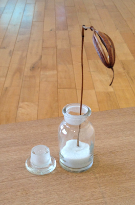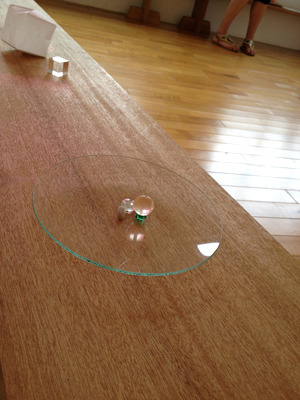 瓶の中に入っているのは、薄くひいて光を当てると虹になるガラス。