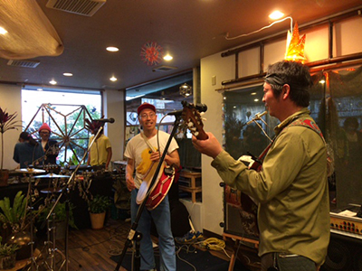 去年の田植え祭りのときに夜、モッカ家で会って一緒にクラブへ行って、「この人めちゃ面白い人だ!」と思ったていう、ハブヒロシと、TURTLE ISLANDの永山愛樹の2人をまっすんが、「一緒にやってほしいんやけど」と初対面ブッキングしたイベントでした。