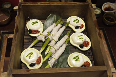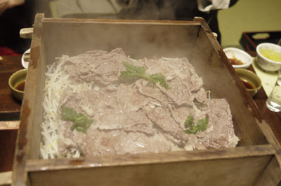 6分、蒸したら完成なので、また次のを下に置いて、蒸された料理を上へ乗せて、