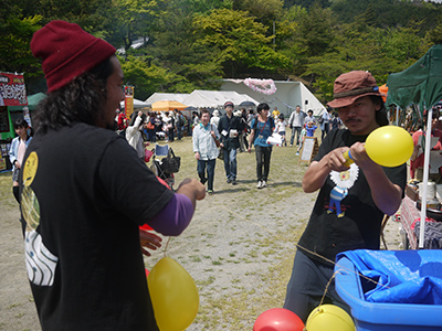 トラベシアで、むやみに風船を膨らます二人。色黒。