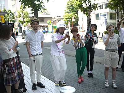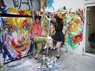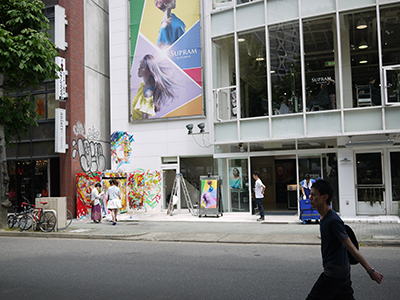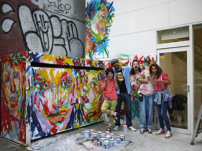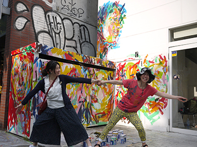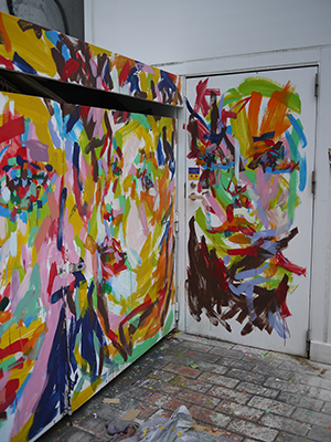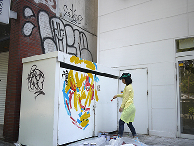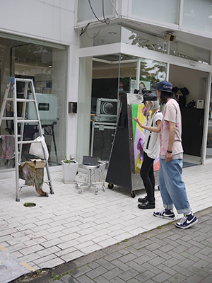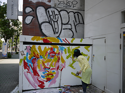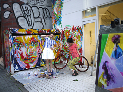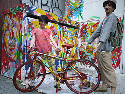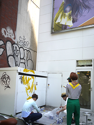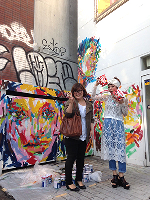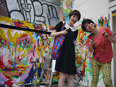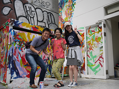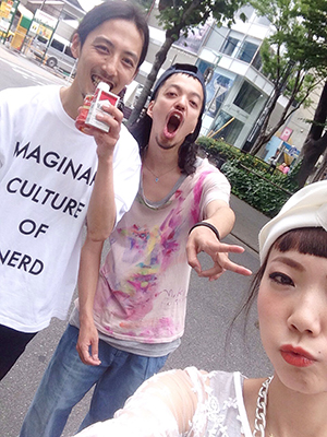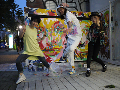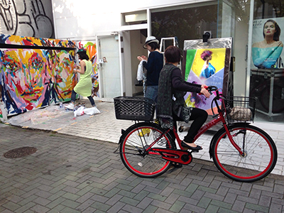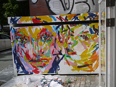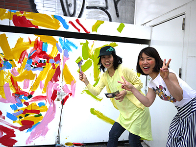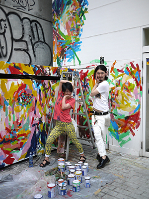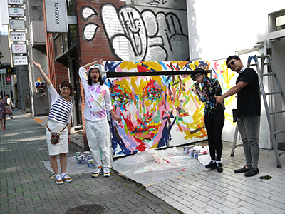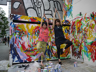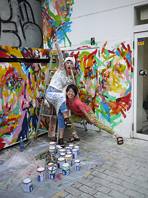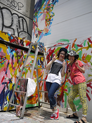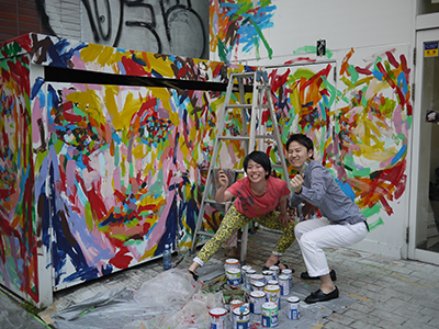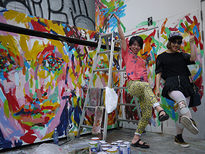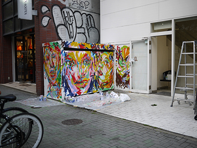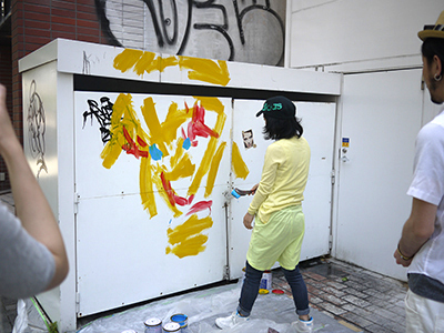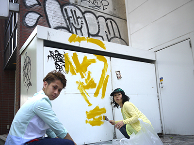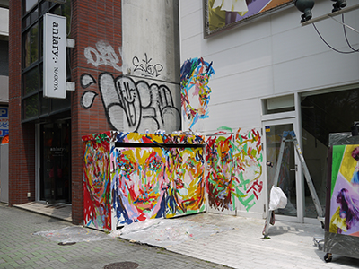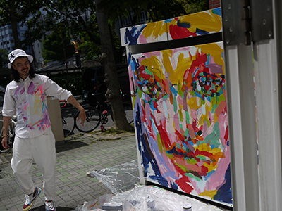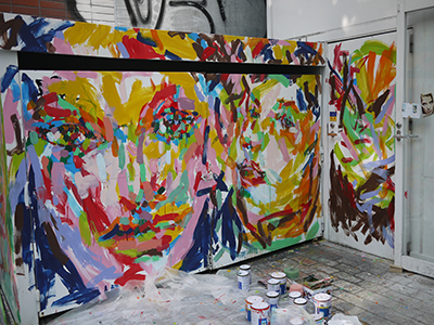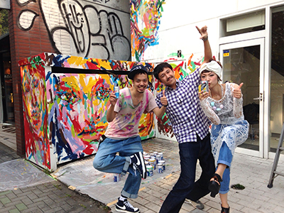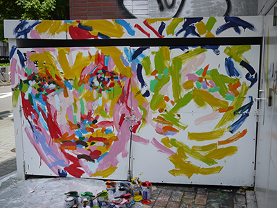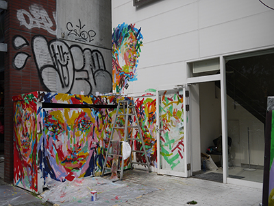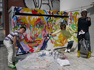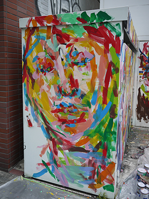 「僕を描いてもいいですよ」とアシスタントの福井くん。ペンキの蓋を開けるのも手伝ってくれました。アイシャドウぬってるみたいな雰囲気あります。"バンコラン"と心で思っていた。