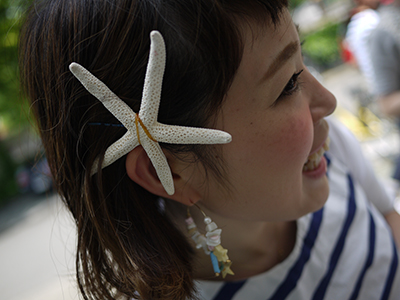 ヒトデをゴムで止める荒業!!でもおしゃれです。そしてよくお似合いです♪