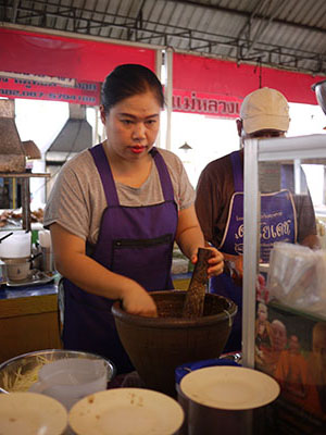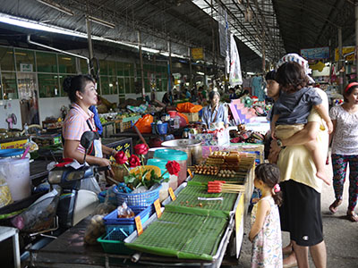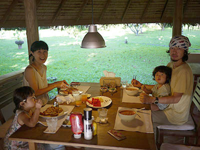 市場で食べ物を買ってきて、みんなでいろいろ食べる。