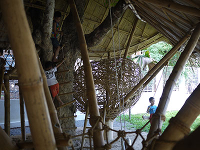竹のアーティストさんが作ってくれたという遊具で楽しそうに遊ぶ子供たち。