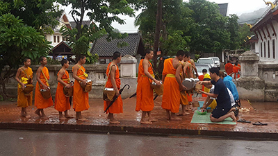 近所を巡るお坊さんたちに食べ物を渡します。