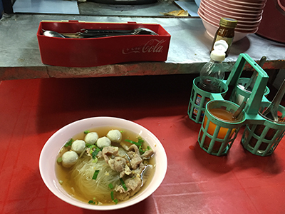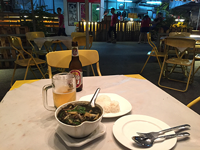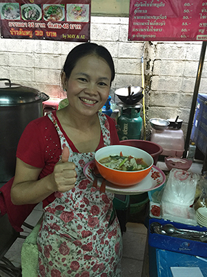 アジアンエアの乗務員さんは、ほんとにピッチリした赤いスーツを着て、化粧濃いめで美人で、夜バンコクへ着きました。宿前の屋台で夕食♪